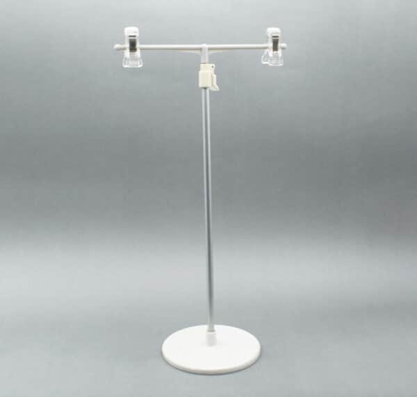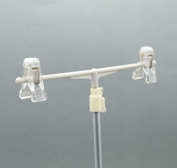 Soporte de metal con ABS. Contiene varilla superior con dos pinzas acrílicas tipo perro. A lo largo, cuenta con una varilla expandible.