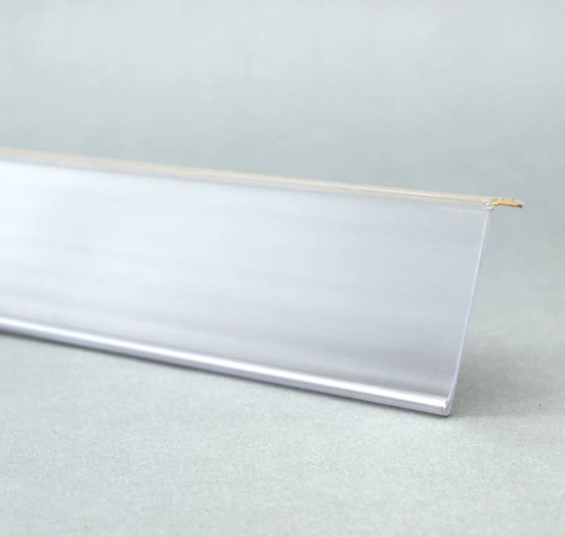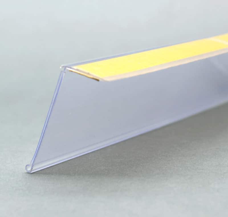 Flejera Tipo L transparente cuenta con una pestaña de 21 mm y en ella se encuentra un adhesivo doble contacto de 12 mm.