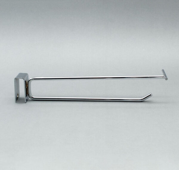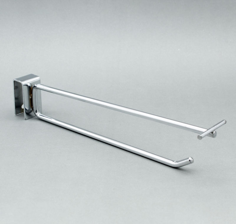 Ganchera doble varilla, los productos van en la vara inferior y en la superior el porta precio. Uso en Sistema de Barra 13 x 38mm. No incluye porta precio.