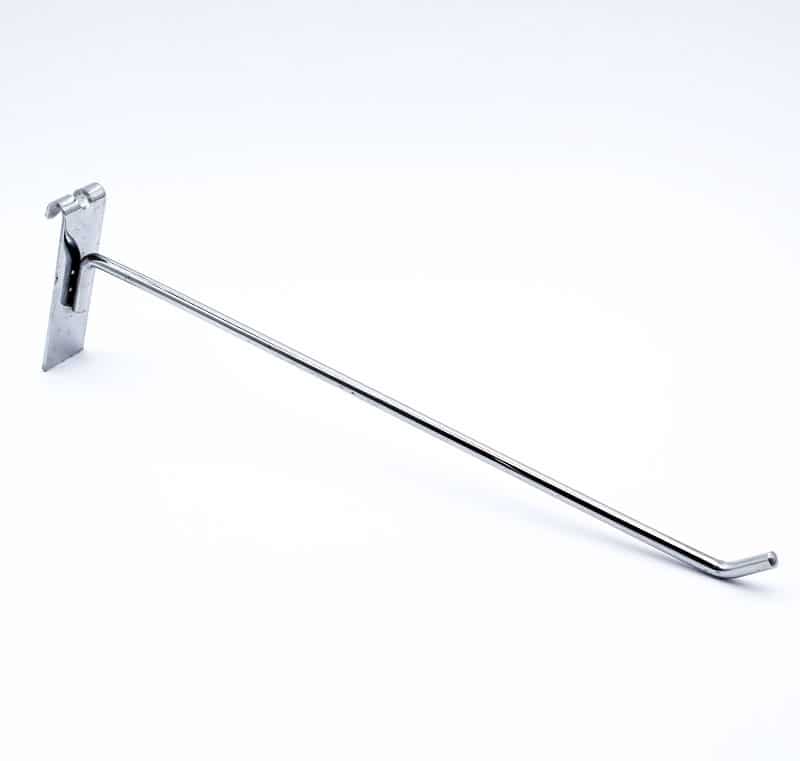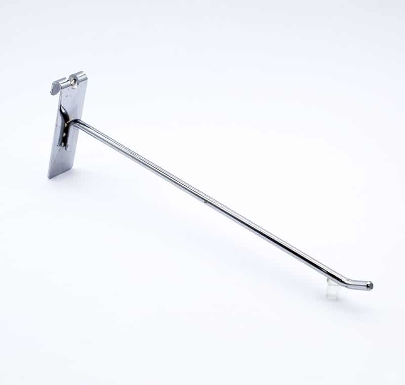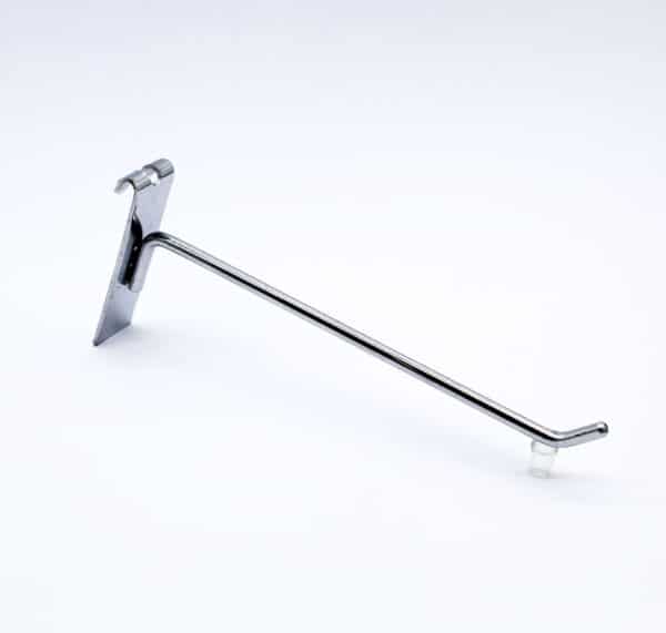 Ganchera metálica con una varilla, ideal para la exhibición de productos en muebles de malla. Posee terminación cromada.