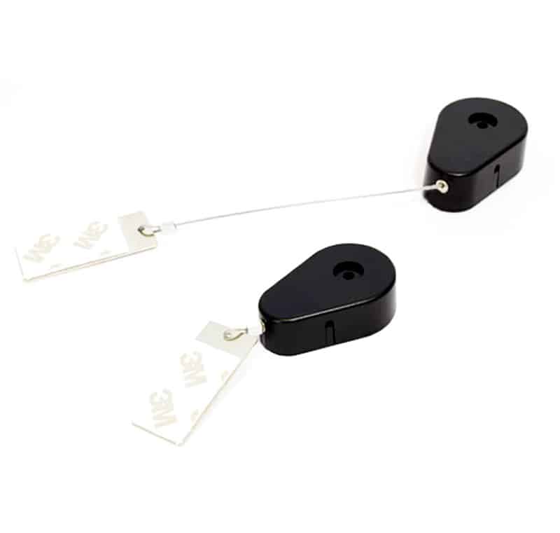 Caja de seguridad cuadrada con piola acerada retráctil, permite exhibir productos para ser manipulados por los clientes y evitar robos.